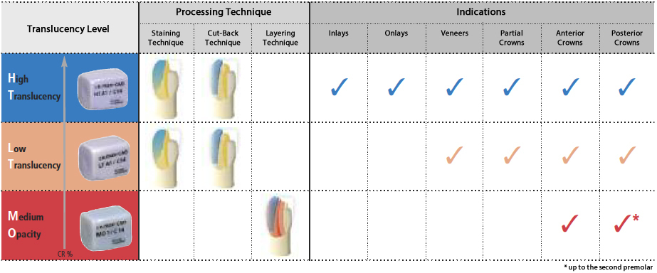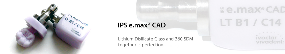 IPS e.max® CADIPS e.max® CAD is an innovative lithium disilicate glass-ceramic (LS 2) block for the CAD / CAM technology. HT-blocks (High Translucency)The HT blocks are available in 16 AD and 4 Bleach BL shades in 2 sizes (I 12, C 14) available. They are due to their high translucency, ideally suited for the grinding of smaller restorations (e.g. inlays and onlays). Restorations made of HT blocks convince nature chameleon effect and an exceptional adaptation to the remaining tooth structure. LT-blocks (Low Translucency)The LT blocks are available in 16 AD and 4 Bleach BL shades in 2 sizes (I12, C14) available. They are ideal because of their low translucency for the fabrication of partial crowns and single crowns in the application of the cut-back technique, but also for the suitable technique. By the final layering with IPS e.max® Ceram Essence and Shade the natural aesthetics can be maximized. MO blocks (Medium Opacity) The MO blocks are available in 5 group shades (MO 0 - MO 4) available in one size (C 14). They are ideally indicated for the fabrication of frameworks on vital or slightly discolored preparations due to their opacity. The anatomical shape is subsequently individually layered using IPS e.max® Ceram. Impulse blocks (Value, Opal)The new Impulse blocks are available in three Value (Value 1, 2, 3) and two opal hues (Opal 1, 2). They are used mainly for the production of thin veneers, veneers, partial and single crowns. Benefits